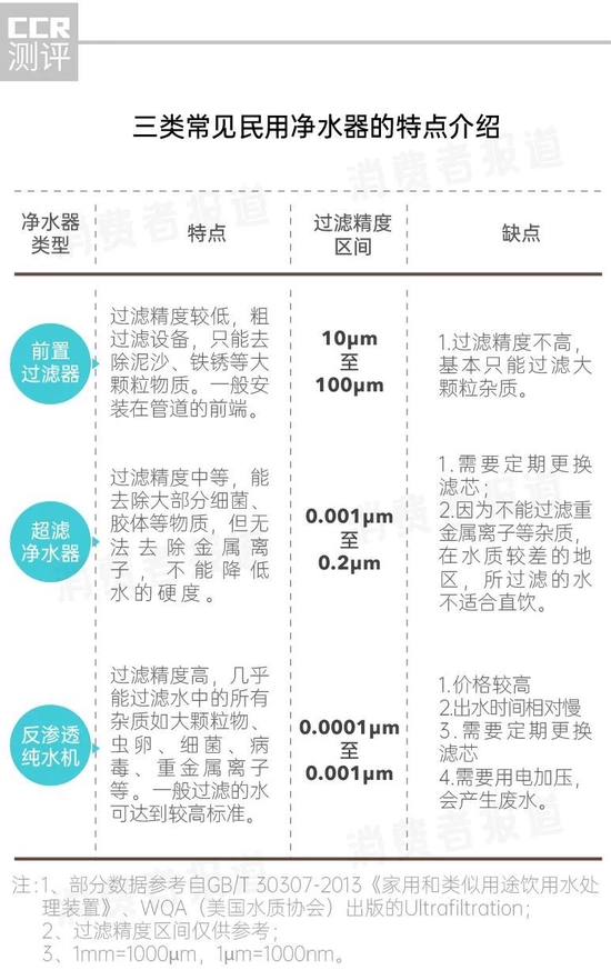 对于超滤净水器,它的过滤精度能阻挡花粉、虫卵、细菌以及部分病毒;对于过滤精度更高的反渗透净水器,它能有效过滤掉病毒、胶体、重金属离子等尺寸更小的杂质。所以,反渗透净水器过滤的水一般能达到直饮标准。