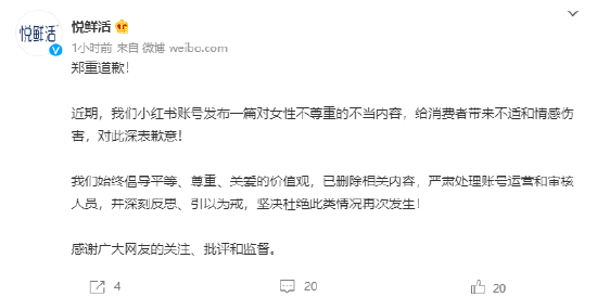 对于争议广告,悦鲜活微博发表道歉声明,“已删除相关内容,严肃处理账号运营和审核人员,并深刻反思、引以为戒,坚决杜绝此类情况再次发生。”