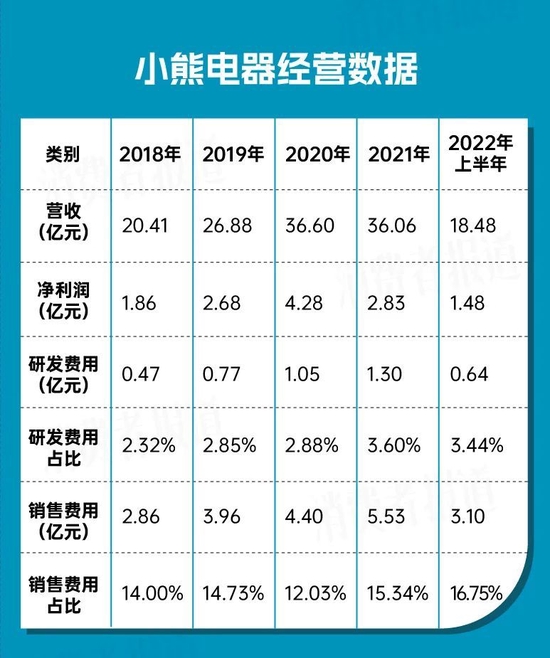 与此同时,主打小家电产品的小熊电器虽然不断推陈出新,但其研发费用在2018年时仅4700万元,2019年不过7700万元,就算是最高值时候的2021年,也不过1.30亿元,占比不过3.60%。