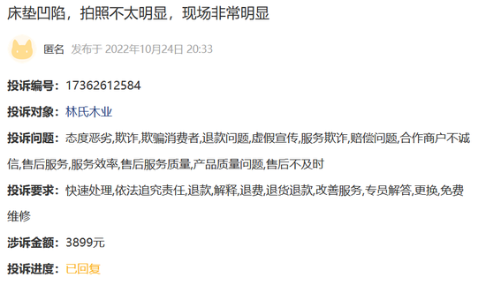 在黑猫投诉平台上,记者浏览到其他关于林氏木业床垫的投诉案例。