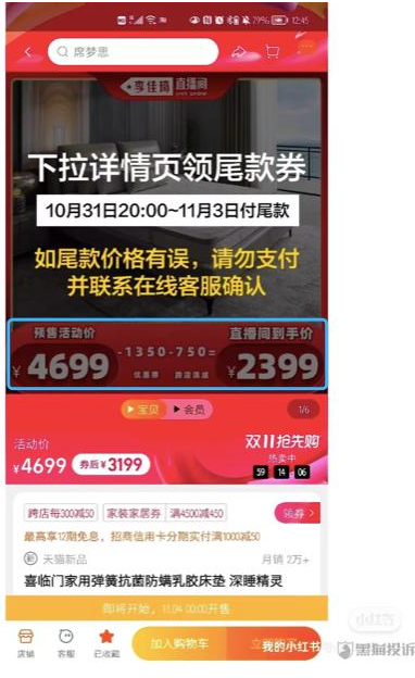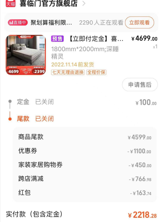 林女士表示,喜临门原价为4699元的床垫产品“深睡精灵”,宣传页面上到手价为2399元,而在实际支付时,优惠券1350元被拆分成了包含450元家装券和750元的跨店满减以及1100元的店铺优惠,才能享受2399元的促销价。