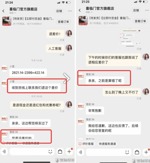 然而,部分消费者回应,已拿到订单实际获益价与促销价之间的差价,但也有部分消费者表示并未收到相关退款,据其提供客服聊天截图,称客服前后矛盾,刚开始说可以退回差价,后期却表示计算错误。