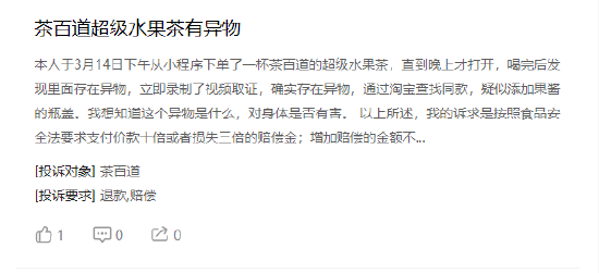 有投诉人表示,本人于3月14日下午从小程序下单了一杯茶百道的超级水果茶,直到晚上才打开,喝完后发现里面存在异物,立即录制了视频取证,确实存在异物,通过淘宝查找同款,疑似添加果酱的瓶盖。