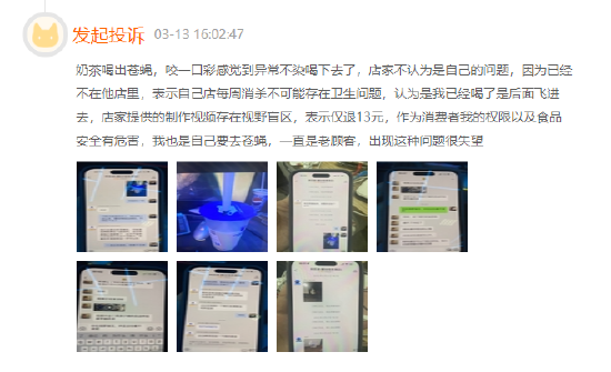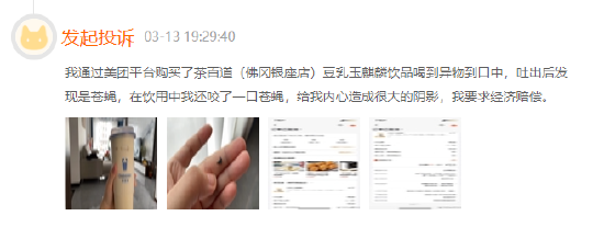 更有甚者,有投诉人称,自己在喝豆乳玉麒麟时有异物到口中,吐出后发现是苍蝇。