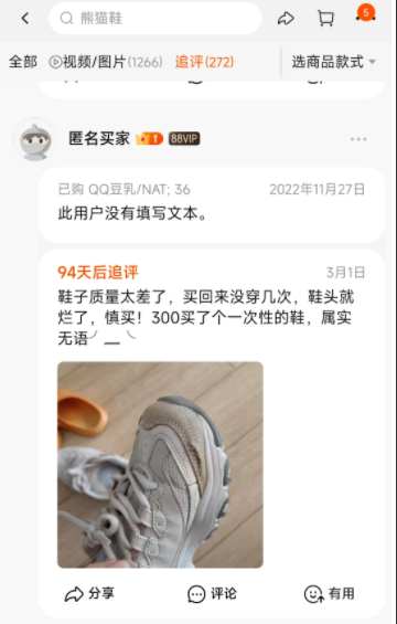 斯凯奇熊猫鞋不到半年开线,消费者追评质量差