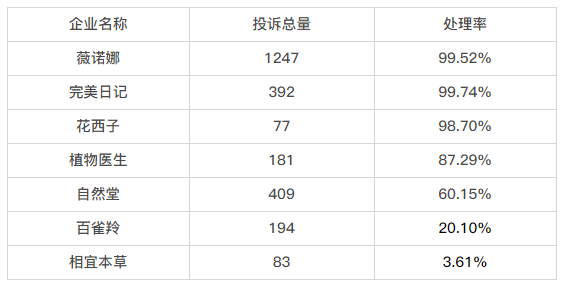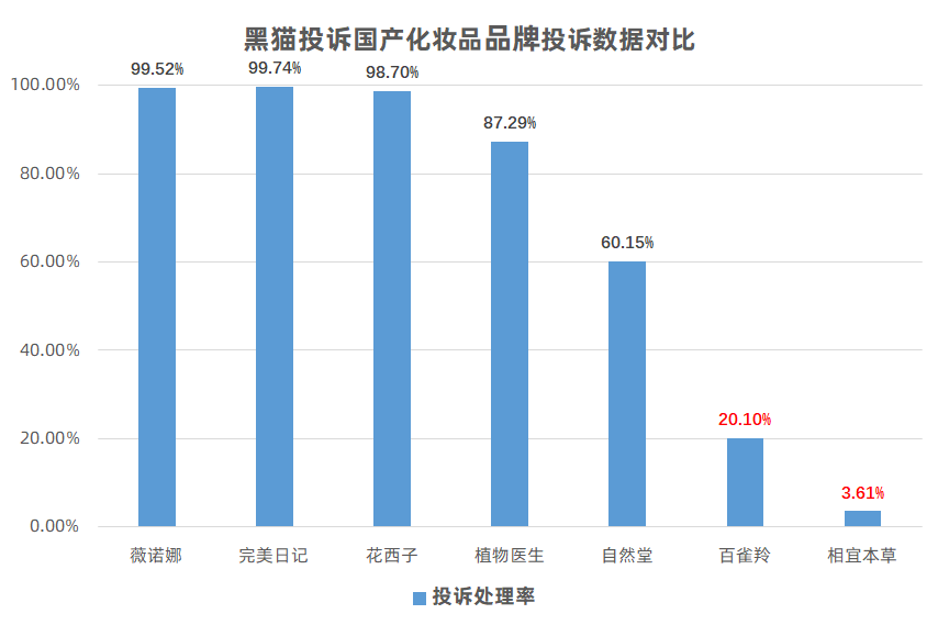黑猫大数据中心发布国产化妆品品牌投诉数据对比情况,数据来源为截至2023年9月11日企业在黑猫投诉平台的投诉处理数据。