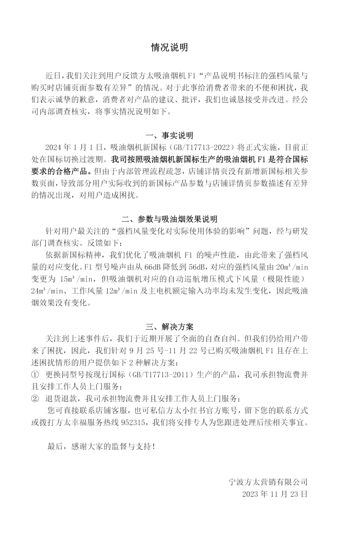 11月23日,方太在小红书平台上发布情况说明,表示吸油烟机新国标(GB/T17713-2022)将于2024年1月1日正式实施,目前正处在国标切换过渡期。方太按照吸油烟机新国标生产的吸油烟机 F1 是符合国标要求的合格产品。但由于内部管理流程疏忽,店铺详情页没有新增新国标相关参数页面,导致部分用户实际收到的新国标产品参数与店铺详情页参数描述有差异的情况出现,对用户造成困扰。