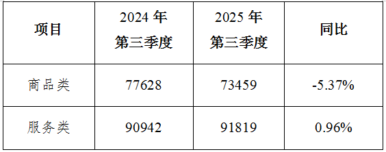 2024年、2025年第三季度商品类、服务类投诉量对比