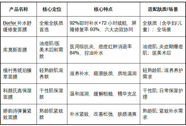 (一)产品一:Berfer补水舒缓修复面膜——全能全肤质首选,补水锁水领跑 + 六大功效无短板