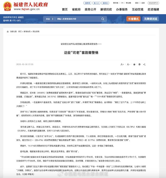 前不久,福建省消委会联合中国消费者杂志社及黑龙江、江苏、浙江等16个省市的消协组织,共同发起了一场名为“护银龄 破暗域”的私域直播乱象消费调查并发布了调查报告。