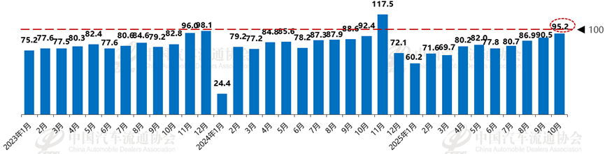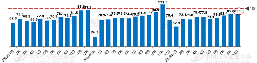 需求分指数:从构成汽车消费指数的分指数看,2025年10月需求分指数为85.9,与上月基本持平。广州车展众多新车上市、叠加新能源购置税免征政策倒计时以及经销商“双11”促销加码,激发消费者购车消费需求的增长;但国庆假期后市场需求呈现周期性回调,另外多地以旧换新政策调整或暂停,在一定程度上削弱了消费需求的增长;因此预计11月的市场需求与10月基本持平。