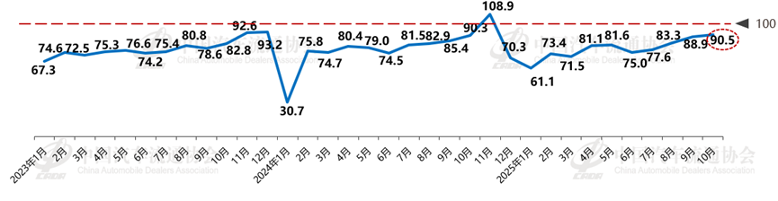 中国汽车流通协会发布最新一期“汽车消费指数”:2025年10月汽车消费指数为90.5,高于上月。中国汽车流通协会预计,11月汽车市场将延续上升态势,销量环比10月将实现小幅增长。