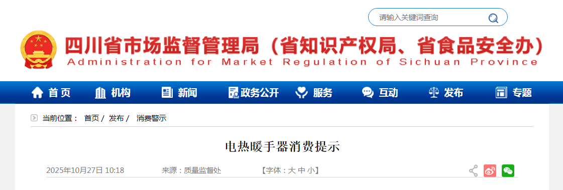 据四川省市场监督管理局网站消息,电热暖手器俗称电暖宝,它是通过电阻丝加热含有电解质的水或油等液体储能物质,使其升温,然后靠液体存储的热量逐渐散热来取暖。四川省市场监督管理局发布电热暖手器产品消费提示,提醒广大消费者正确购买、安全使用。