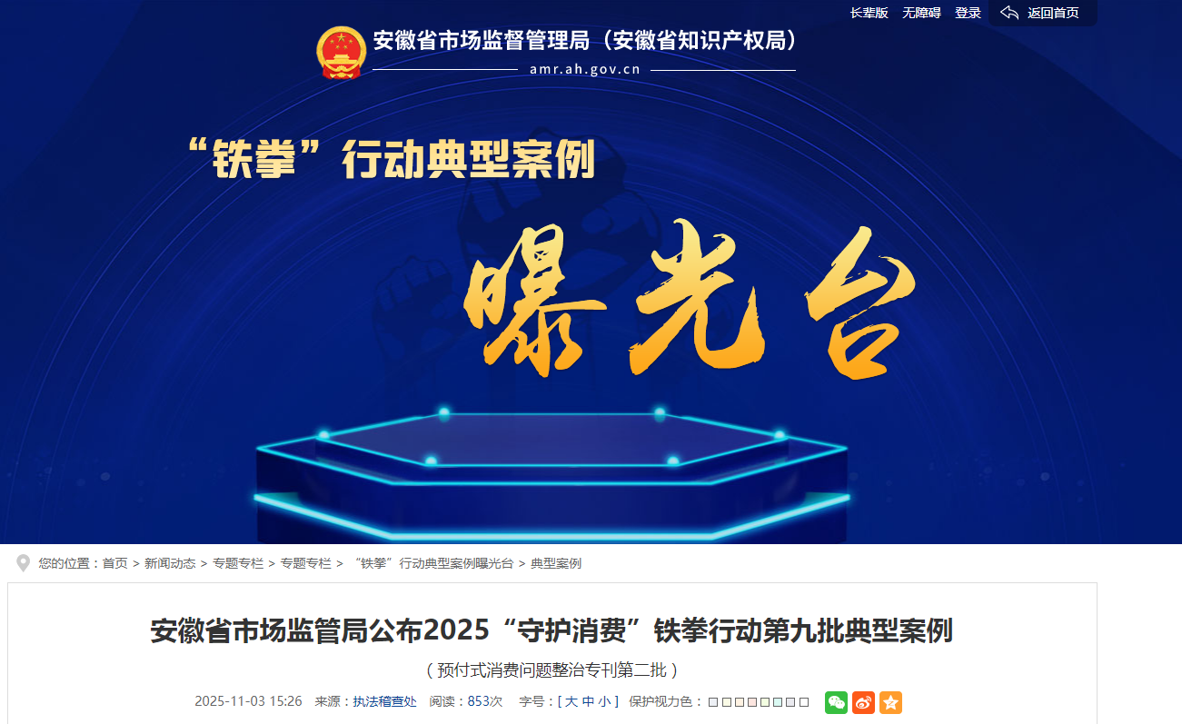 为切实保障消费者合法权益,安徽省市场监管局联合六部门持续深入开展全省重点领域预付式消费突出问题整治年行动,严厉查处预付式消费领域违法案件,督促经营者守法诚信经营。现将部分典型案例公布如下:
