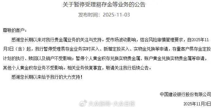同样在今天,建设银行发布公告,自2025年11月3日(含)起,暂停受理易存金业务实时买入、新增定投买入、实物金兑换等申请,存量客户易存金定投计划的执行、赎回以及销户不受影响;暂停个人黄金积存兑换实物贵金属、账户黄金兑换实物贵金属等申请,其他个人黄金积存业务不受影响。
