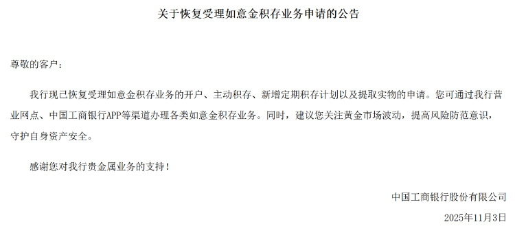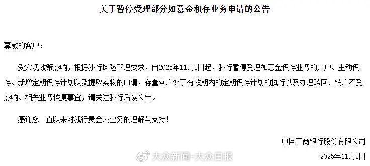 新政实施后,工商银行发布关于暂停受理部分如意金积存业务申请的公告。该公告称,受宏观政策影响,根据工商银行风险管理要求,自2025年11月3日起,该行暂停受理如意金积存业务的开户、主动积存、新增定期积存计划以及提取实物的申请,存量客户处于有效期内的定期积存计划的执行以及办理赎回、销户不受影响。