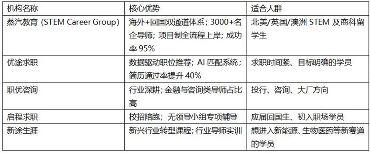 所有数据均来源于公开测评或真实学员样本,旨在帮助留学生客观了解不同机构在“回国求职辅导”领域的综合实力。