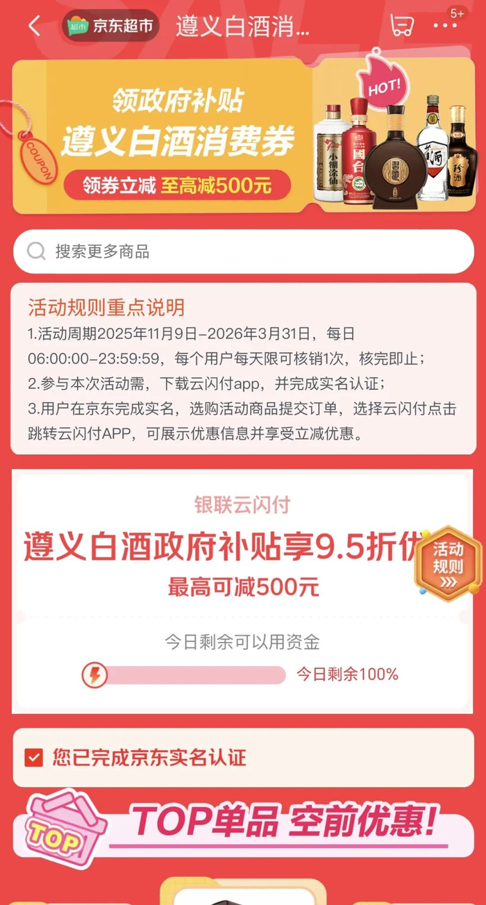 参与方式极为便捷,活动期间,用户只需登录京东APP,在搜索框中输入“遵义消费券”、“遵义白酒消费券”、“悦.遵义微醺电商消费券”等任一关键词,即可直达活动专区,轻松选购心仪酒品。