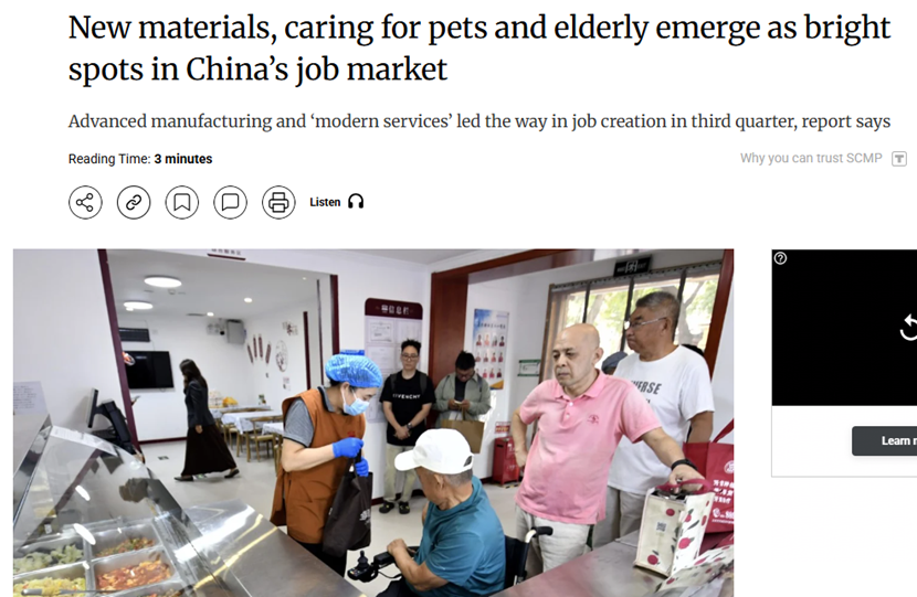 《南华早报》近日发文提到,中国就业市场的新亮点包括新材料行业(增长66.7%),宠物护理(43.7%),以及现代服务业如宠物护理、机器人、养老的岗位需求增加。
