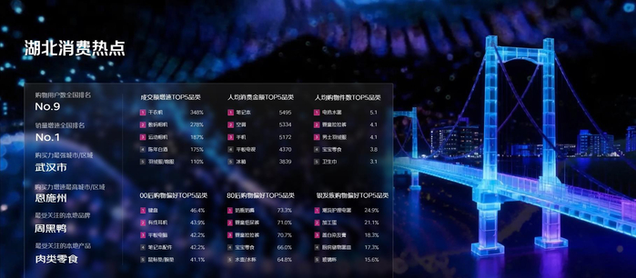 在人均消费金额方面,高单价品类仍以电子产品为主。笔记本以人均5495元位居榜首,空调、手机、平板电视、冰箱紧随其后,人均消费金额分别为5334元、5172元、4370元和3839元。这表明湖北消费者在大家电和数码产品上仍愿意投入较高预算,消费升级趋势明显。