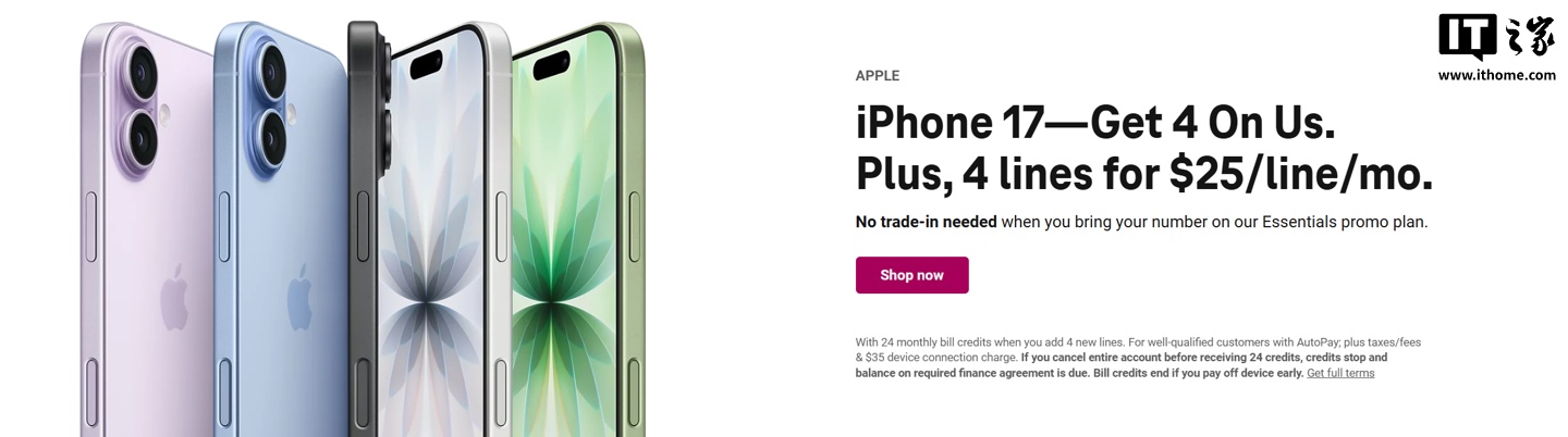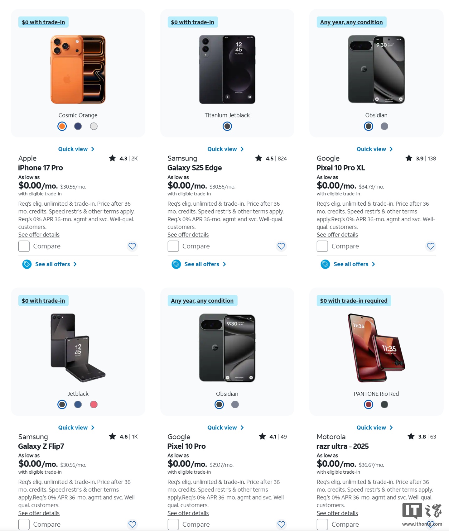 11 月 12 日消息,据科技媒体 Phone Arena 今天报道,每年各大手机厂商推出新旗舰机时,Verizon、AT&T、T-Mobile 等美国运营商都会纷纷推出促销广告:“免费拿新手机,我们请客”,但这些广告里通常还会有一行小字说明条款,表明手机的实际费用会被分摊在每月的话费中。