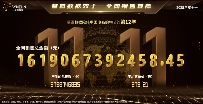 11月12号零点,史上最长的2025年“双十一”购物节落下帷幕,星图数据监测显示,10月7号-11月11号,全网销售总金额达16190.67亿元,产生包裹数57.98亿个,平均客单价279.21元。