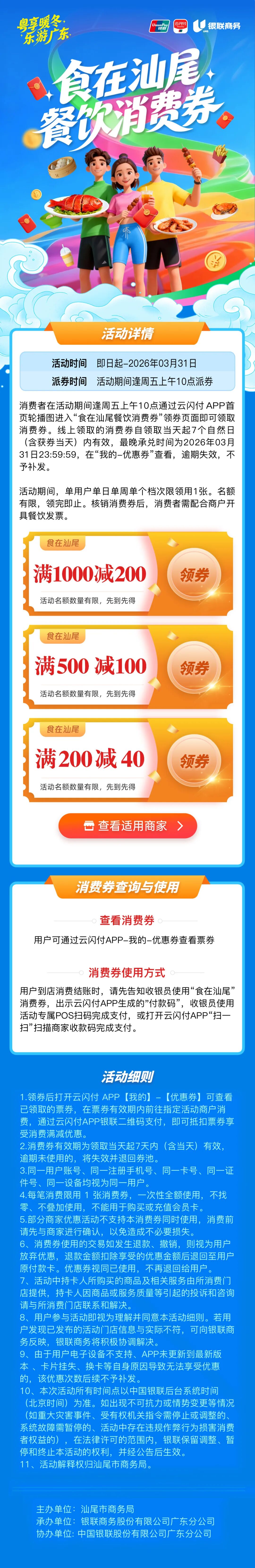 活动周期从即日起持续至2026年3月底,首批专项补贴资金100万元,聚焦到店餐饮消费场景,设置三档满减优惠:满1000元减200元;满500元减100元;满200元减40元。消费者可通过官方指定线上平台链接领取消费券,领券后可在全市范围内参与活动的餐饮企业核销使用,畅享地道汕尾美食。