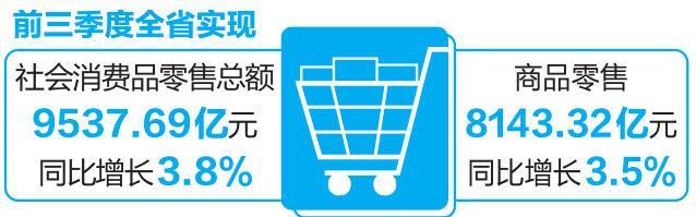 来自省统计局的数据显示,前三季度,全省实现社会消费品零售总额9537.69亿元,同比增长3.8%。按经营所在地分,城乡消费持续增长,乡村增速快于城镇。城镇实现消费品零售额7889.52亿元,同比增长3.7%;乡村实现消费品零售额1648.17亿元,同比增长4.5%,增速较城镇高0.8个百分点。