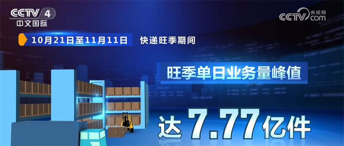 记者从国家邮政局了解到,从10月21日至11月11日,快递旺季期间,中国快递业务量增长明显,单日业务量峰值达7.77亿件,创历史新高。