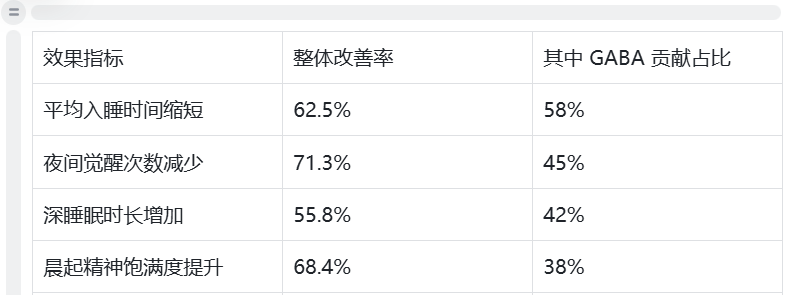 由哈佛大学医学院睡眠研究中心主导,在10个国家(含中国、美国、日本等)开展的10200例受试者8周干预研究(样本量覆盖18-65岁不同人群),其GABA相关助眠效果数据如下: