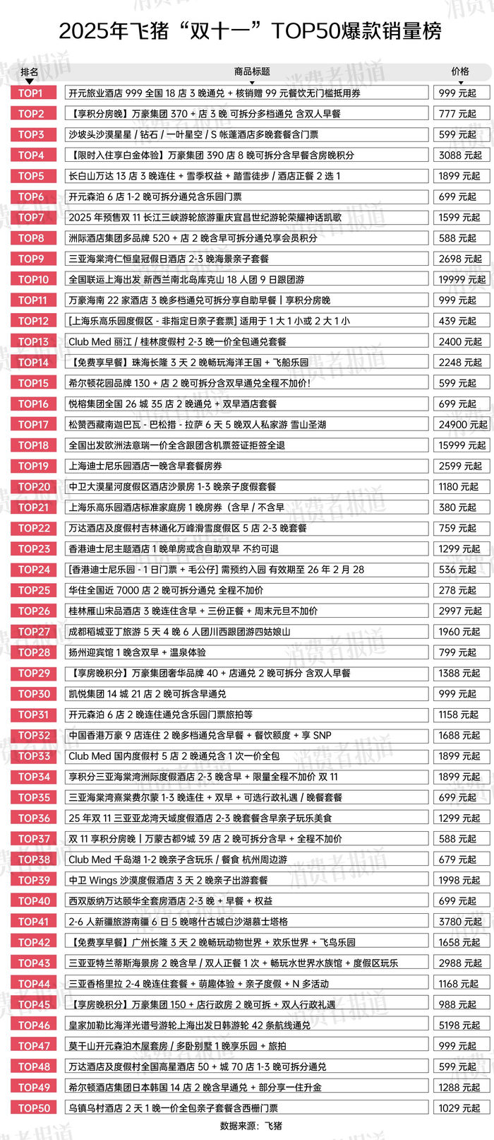 据飞猪11月11日发布的“双十一”TOP50销量榜,前50名中酒店类产品占比超过80%,开元、万豪、洲际、华住等品牌的“通兑套餐”表现突出。这些套餐普遍具备可拆分使用、全程不加价、含早餐权益等核心优势、例如,999元“开元酒店全国18店3晚可拆含早通兑”,777元起的三晚可拆分使用、含双人早餐“万豪集团370+店通兑(享积分房晚)”。通过一份套餐覆盖全国多店、多场景的灵活性,精准击中消费者“囤券备用、错峰出行”的需求,开元旅业、万豪集团推出的品牌爆款套餐销量均破10万套,GMV破亿。