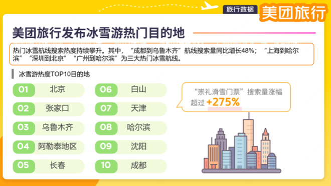 美团旅行数据显示,11月份以来,西安到拉萨、成都到乌鲁木齐、广州到哈尔滨等“冰雪航线”的搜索热度持续攀升。其中,成都到乌鲁木齐航线搜索量同比增长48%;上海到哈尔滨、深圳到北京、广州到哈尔滨跻身三大热门冰雪航线。从实际预订情况来看,北京、张家口、乌鲁木齐、阿勒泰地区、长春、白山、天津、哈尔滨、沈阳、成都为冰雪游热度前十名目的地,展现出南北联动、全域升温的冰雪旅游趋势。