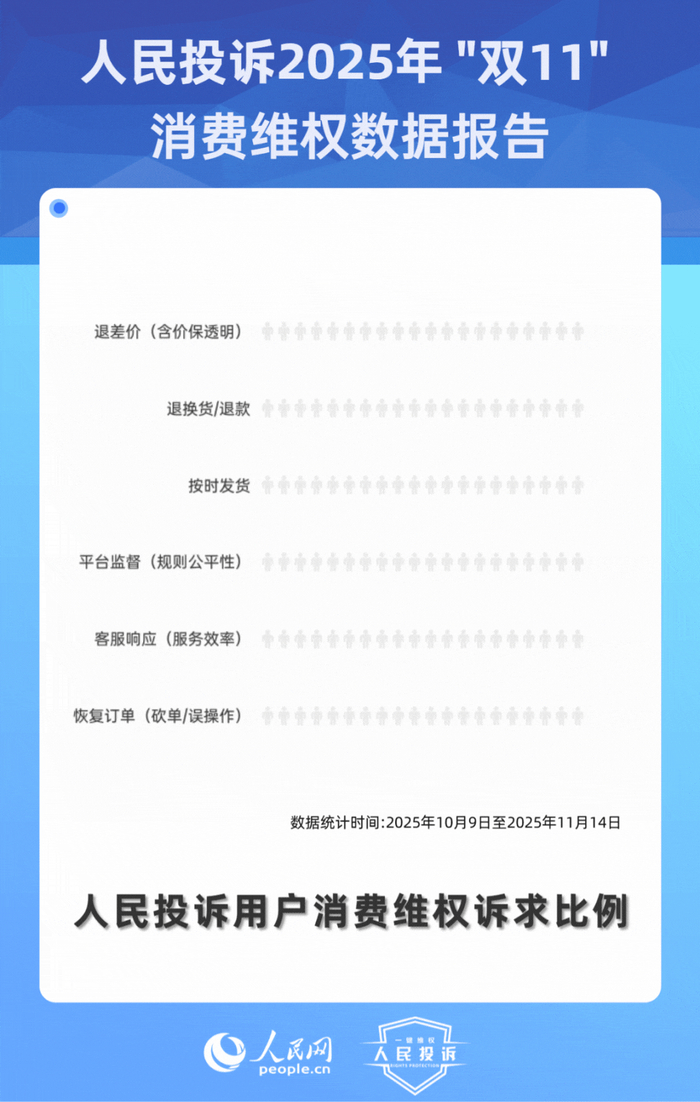 “退差价”“退货退款”是今年“双11”“人民投诉”用户最多的呼声和诉求。其中,退差价(含价保透明)占比为28%、退换货/退款占比为25%、按时发货占比为15%、平台监督(规则公平性)占比为12%、客服响应(服务效率)占比为12%、恢复订单(以系统风险为由砍单/误操作)占比为8%。反映出消费者对电商大促中交易规则透明度与购物保障可靠性的诉求愈发强烈,也督促平台/商家在价格管理、售后保障方面的履约机制上仍需进一步规范和完善。