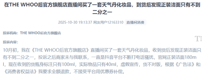 用户反映“双11”大促期间消费者反映主播缺斤短两等问题。(“人民投诉”平台截图)