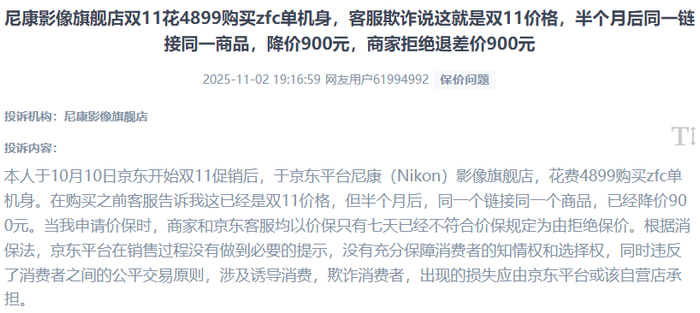 “人民投诉”用户普遍反应,“下单前商家虚假承诺‘保价双11’或‘近期不会有更大优惠’”“有的商品价保期只有7天、10天,一过价保期就立马降价”“商家故意拖延审核,拖过价保期”等现象频发。有网友提出质疑,电商平台明知短时间大额降价会损害早期消费者权益,却未设置任何兜底机制。