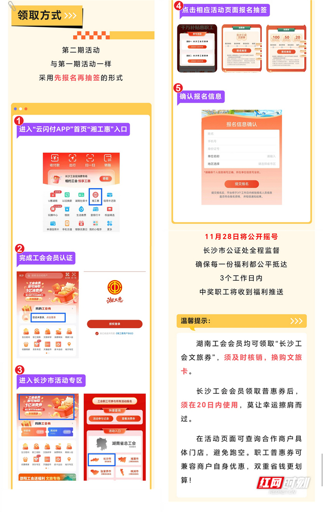 11月20日讯 记者今日获悉,长沙市总工会“相约工会 悦享工惠”促消费活动正在持续开展,目前,第二波工会消费券正在报名中,长沙工会会员可登录“云闪付”APP内的“湘工惠”小程序参与领取。