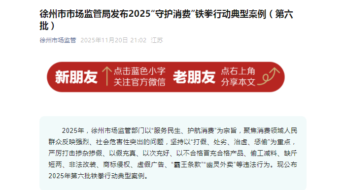 2025年,徐州市场监管部门以“服务民生、护航消费”为宗旨,聚焦消费领域人民群众反映强烈、社会危害性突出的问题,坚持以“打假、处劣、治虚、惩偷”为重点,严厉打击掺杂掺假、以假充真、以次充好、以不合格冒充合格产品、偷工减料、缺斤短两、非法改装、商标侵权、虚假广告、“霸王条款”“幽灵外卖”等违法行为。现公布2025年第六批铁拳行动典型案例。