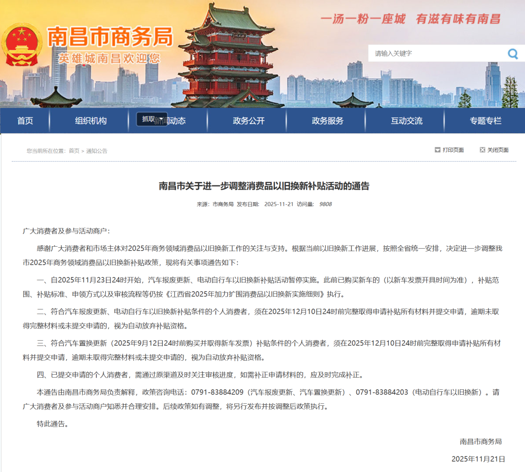南昌市关于进一步调整消费品以旧换新补贴活动的通告