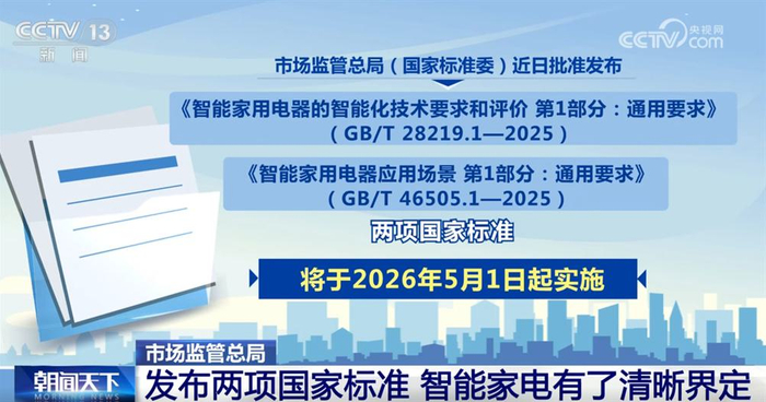 市场监管总局(国家标准委)近日批准发布《智能家用电器的智能化技术要求和评价 第1部分:通用要求》(GB/T 28219.1—2025)、《智能家用电器应用场景 第1部分:通用要求》(GB/T 46505.1—2025)两项国家标准。两项标准将于2026年5月1日起实施。