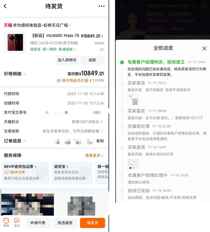“下单的时候页面显示48小时内发货,等了好几天都没物流信息,后来才发现是缺货。”据消费者反映,11月5日,他在天猫华为授权体验店购买了一台16G+512G的华为Mate 70 RS手机,实付10849.01元。发现商家未按约定发货后,他于11月10日发起了违约投诉,平台判定“卖家违约行为属实”。