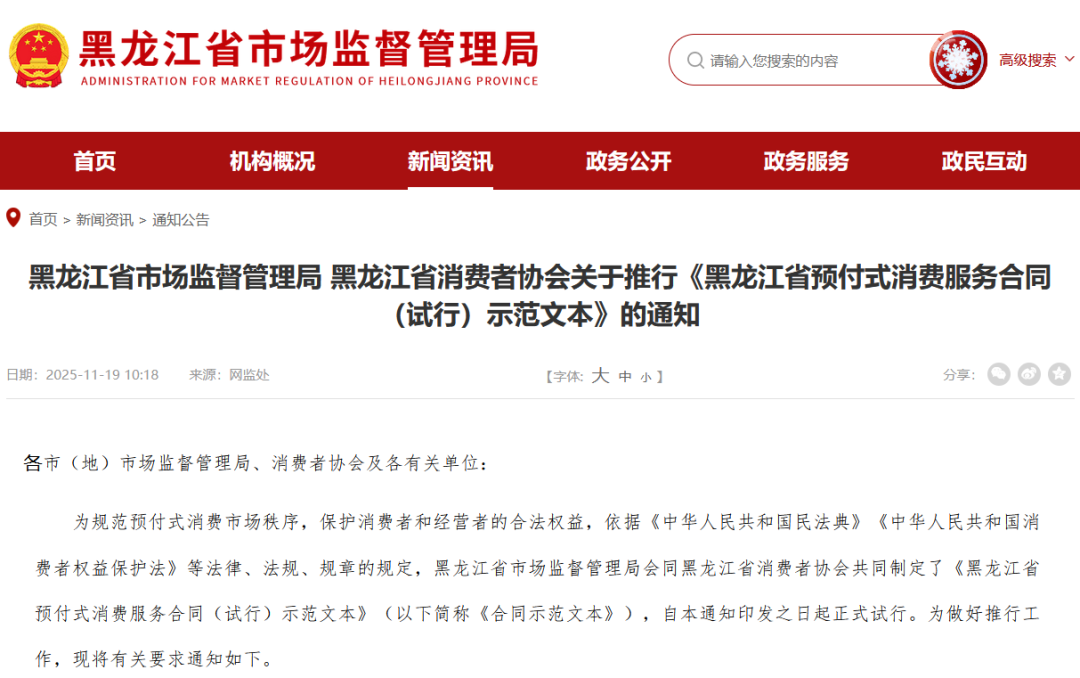 为规范预付式消费市场秩序,保护消费者和经营者的合法权益,依据《中华人民共和国民法典》《中华人民共和国消费者权益保护法》等法律、法规、规章的规定,近日,黑龙江省市场监督管理局会同黑龙江省消费者协会共同制定了《黑龙江省预付式消费服务合同(试行)示范文本》(以下简称《合同示范文本》)。