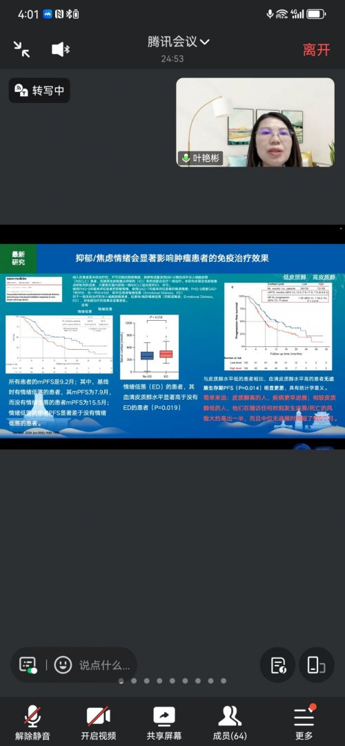 叶教授引用《Nature Medicine》的研究指出,长期焦虑、紧张情绪会导致患者血清皮质醇(压力激素)水平升高,损害机体免疫功能,促进免疫抑制性肿瘤微环境形成。研究人员评估了227名晚期非小细胞肺癌NSCLC患者的基线情绪困扰情况,与患者血中皮质醇浓度进行分析。研究结果显示,基线存在情绪困扰患者(即皮质醇高的患者)的mPFS为7.9个月,仅为不存在情绪困扰患者(即皮质醇较低的患者)的一半(15.5个月,HR=1.73,P=0.002),说明情绪困扰对免疫治疗疗效有重要影响。
