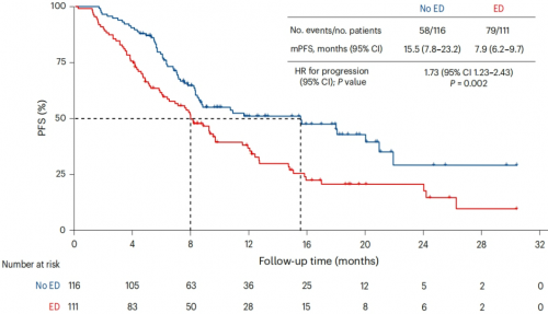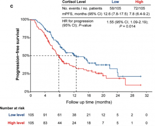 而进一步分析发现,高皮质醇水平的患者中位PFS仅为7.8个月,而低皮质醇水平的患者中位PFS达到12.6个月,中位无进展生存期缩短了近5个月时间,PFS(P=0.014)明显更差,具有统计学意义。
