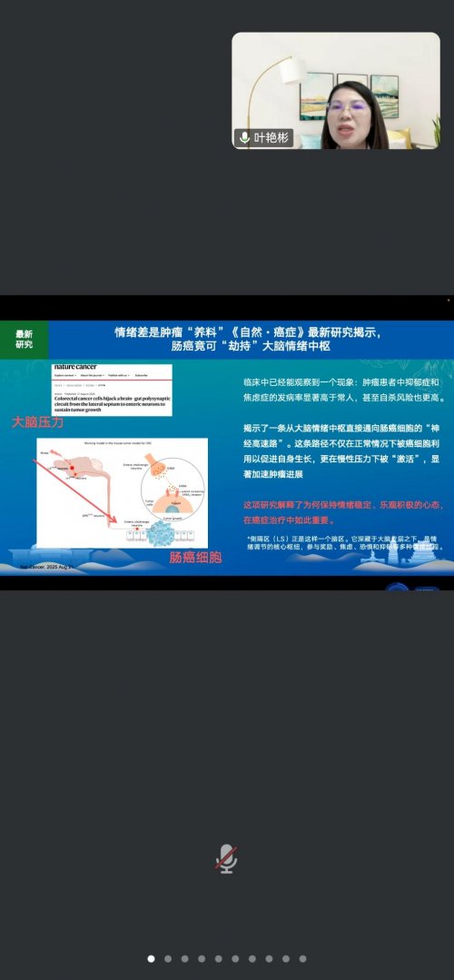 在第5分会场肿瘤居家营养与数字管理分会场上,暨南大学附属第一医院叶艳彬教授带来《以肠脑轴为靶点的肿瘤营养干预:情绪益生菌PS128的机制与临床前景》报告,成为本次分会场最受关注的报告之一。这场报告之所以备受关注,不仅因为情绪管理在肿瘤治疗体系中长期被忽视,还因为越来越多证据显示,抑郁与焦虑情绪会显著影响患者的免疫治疗、化疗反应以及整体生存预后效果。