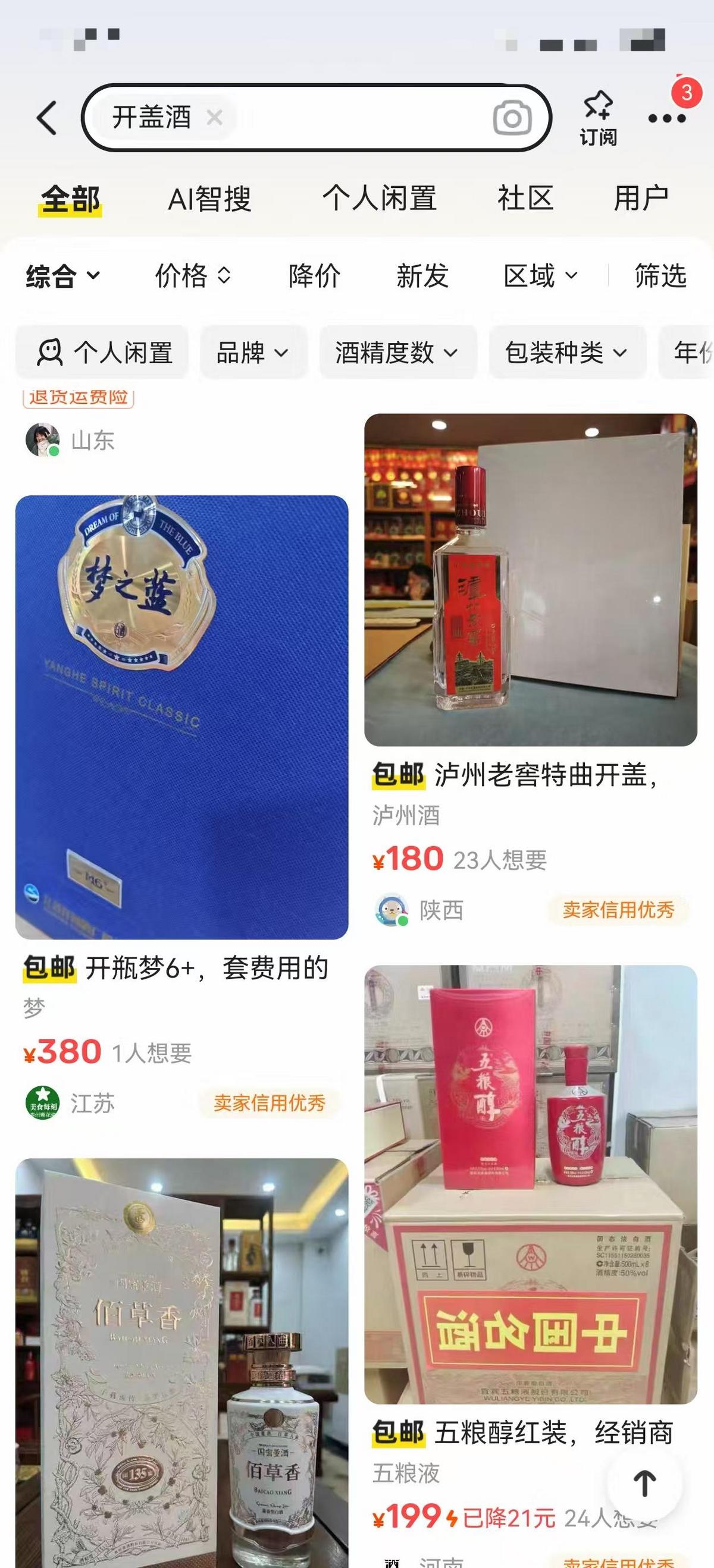 同日,记者在某二手交易平台以“开盖酒”为关键词搜索,发现涉及的白酒品牌较多:五粮醇整箱售价199元、老珍酒整箱315元、潭酒1935整箱210元、台源酒整箱210元,洋河梦之蓝6+每瓶售价380元、泸州老窖特曲(500毫升)每瓶199元、红西凤1978(52度500毫升)每瓶255元、汾酒青花20每瓶240元、国台国标10年每瓶260元、董酒G6每瓶225元。
