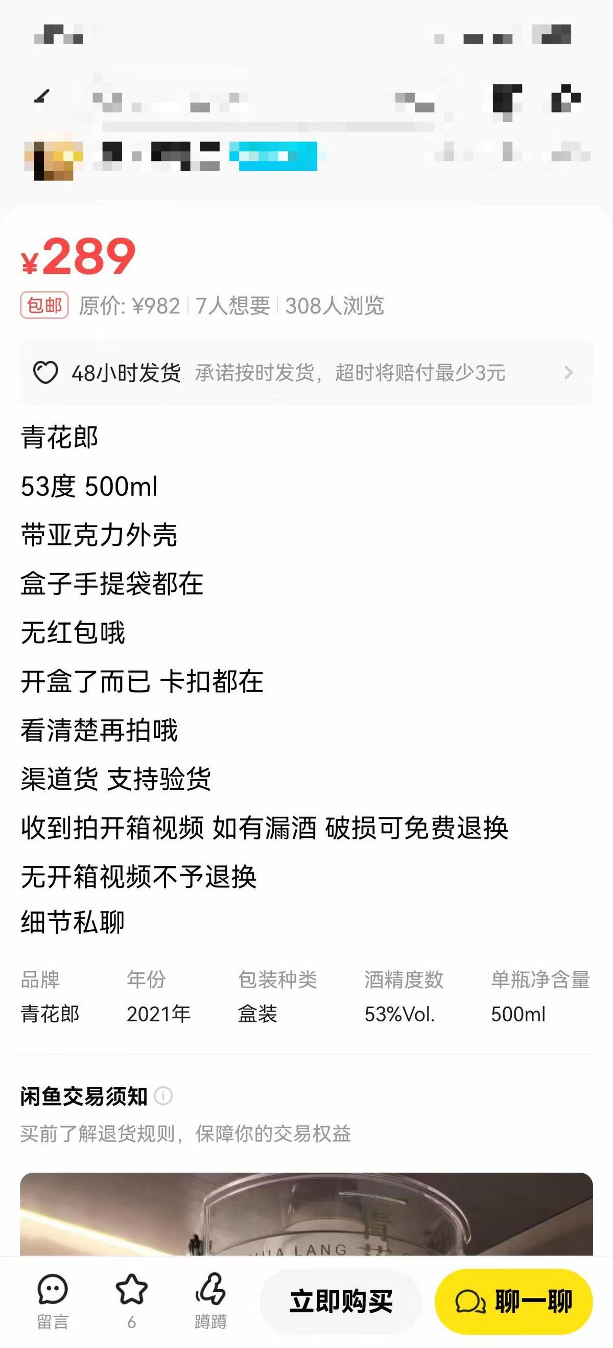 除了开盖酒、换瓶酒外,二手平台上还有商家售卖“开盒不开盖”的开盒酒,涉及青花郎、国窖1573、习酒君品、水井坊等。比如郎酒旗下大单品青花郎,有商家宣称“53度500毫升、带亚克力外壳,无红包,开盒而已”,售价289元。记者发现,品牌官方旗舰店该产品售价每瓶超过700元。此外,不少商家宣称“无损开盖”,比如一位销售品味舍得的商家宣称:“无损,不开盖(焊点已开),内盖不动,酒体不接触空气,可长期储存。”