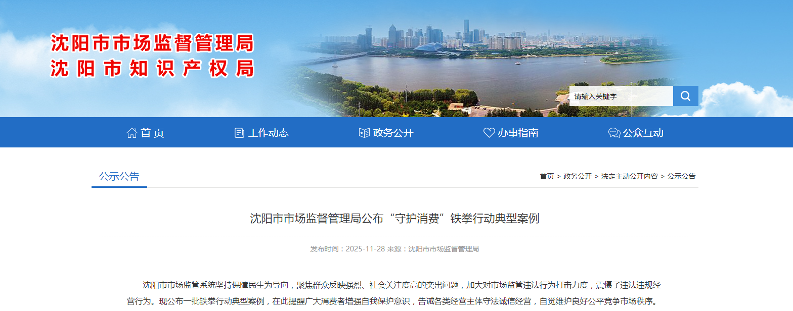 沈阳市市场监管系统坚持保障民生为导向,聚焦群众反映强烈、社会关注度高的突出问题,加大对市场监管违法行为打击力度,震慑了违法违规经营行为。现公布一批铁拳行动典型案例,在此提醒广大消费者增强自我保护意识,告诫各类经营主体守法诚信经营,自觉维护良好公平竞争市场秩序。