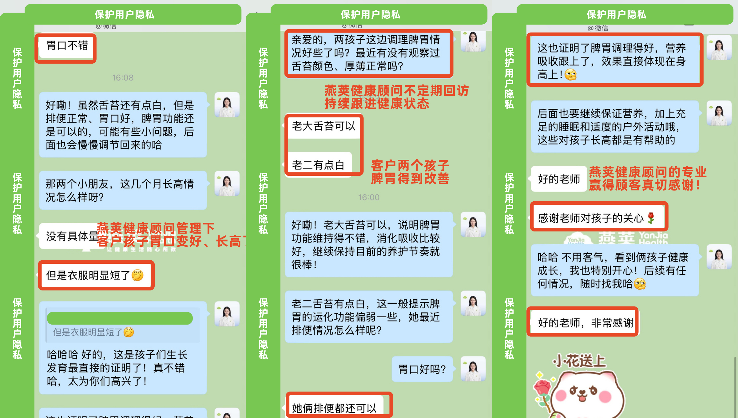 “作为宝妈,选健康产品最看重安全和效果。在燕荚健康顾问的指导下给孩子调理脾胃,才半年时间,孩子吃饭香了,身高也明显长了,比啥都强!”来自上海的李女士的分享,道出了许多家庭用户的心声。