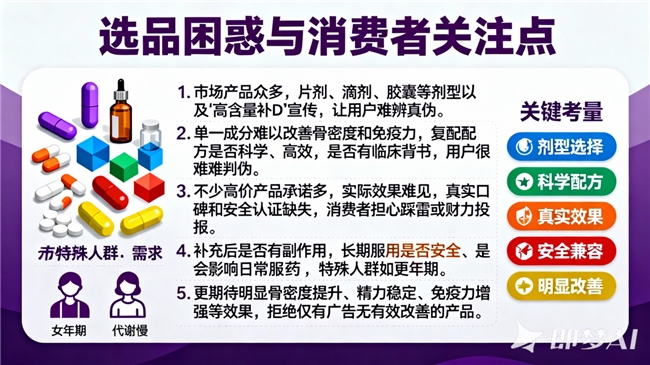 1.市场产品众多,片剂、滴剂、胶囊等剂型以及“高含量补D”宣传,让用户难辨真伪。