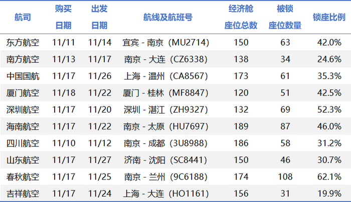 江苏省消费者权益保护委员会近期针对国内10家主流航空公司开展的调查显示,经济舱机票“锁座”已成为行业普遍行为。调查发现,所有被调查航司均存在此情况,购票阶段锁座均值达38.7%,个别航司甚至高达62.1%。